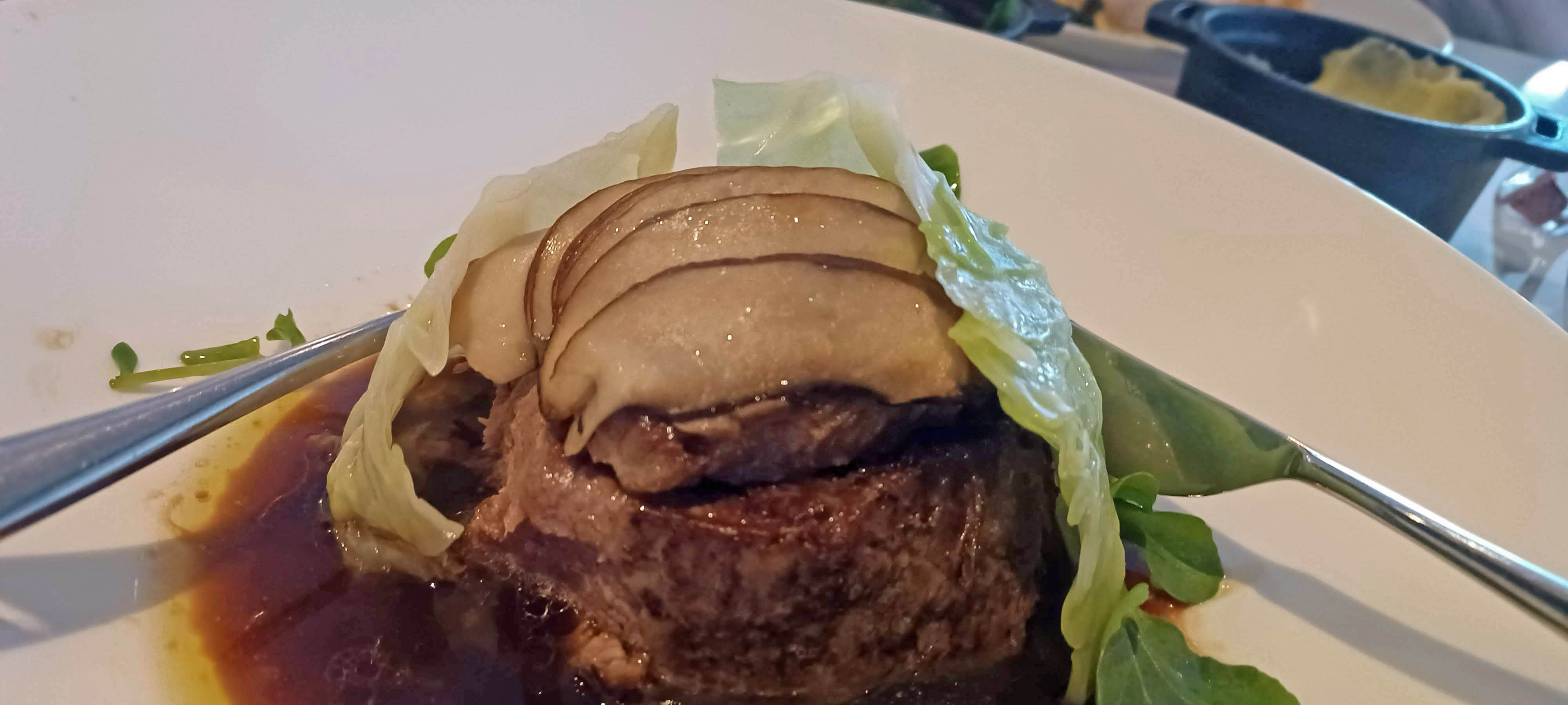 O’Mahony Butchers of the English Market supplied the beef for our next dish. The fillet came with egg yolk, Cucumber, Moyahsi, and Namul (€16.50). We were tipped off in advance that this was something like a carpaccio and so it proved. But the marinated beef, super tasty with all its accompaniments, was cut, not into thin rounds but instead into finger-sized strips, the better to take up the marinade! Delicious.